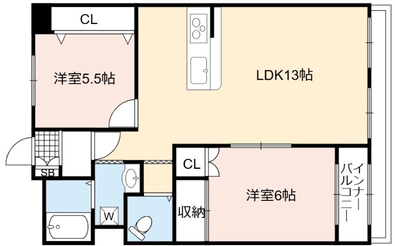 | 間取り詳細 | LDK 13畳 、 洋室 6畳 、 洋室 5.5畳 |