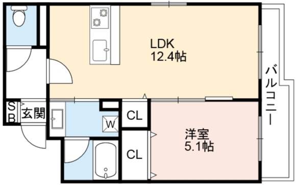| 間取り詳細 | LDK 12.4畳 、 洋室 5.1畳 |