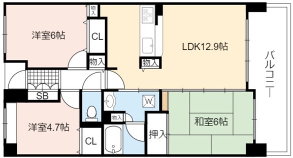 | 間取り詳細 | LDK 12.9畳 、 洋室 6畳 、 和室 6畳 、 洋室 4.7畳 |