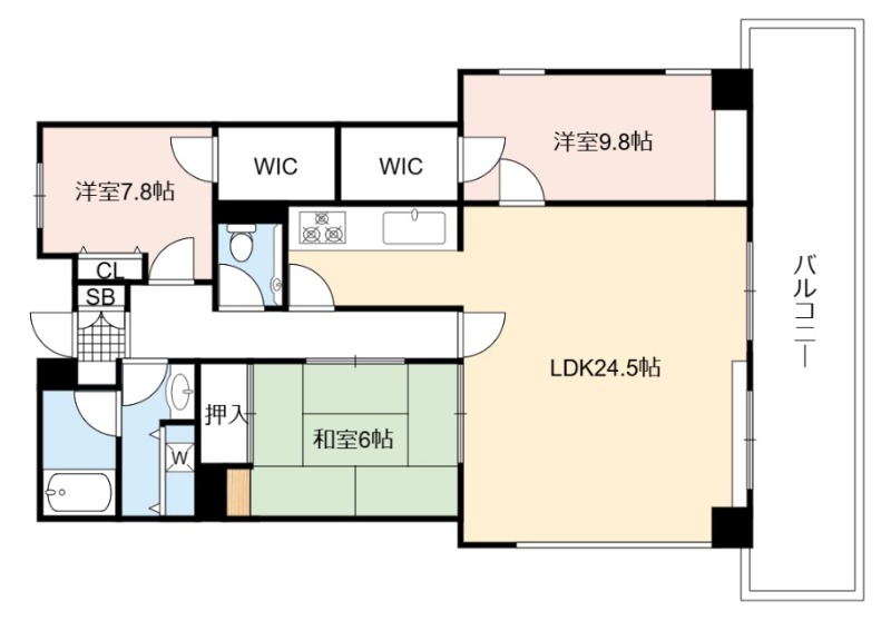 洋室 9.8畳 洋室 7.8畳 和室 6畳 |