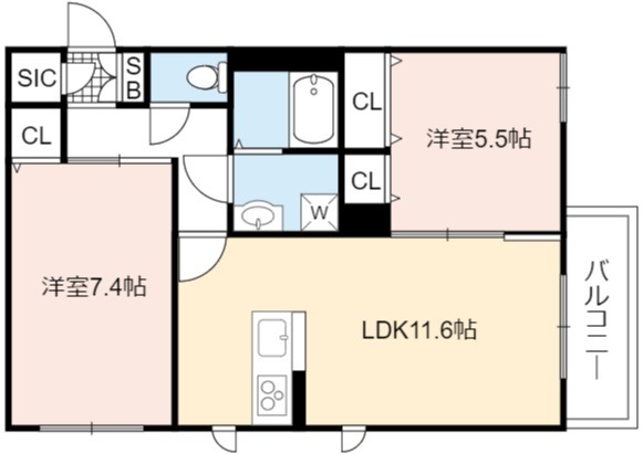 | 間取り詳細 | LDK 11.6畳 、 洋室 7.4畳 、 洋室 5.5畳 |
