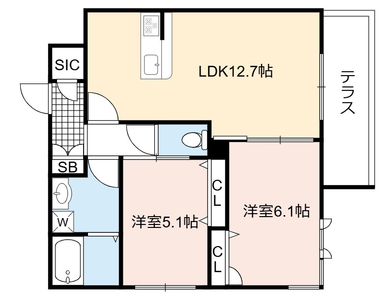 | 間取り詳細 | LDK 12.7畳 、 洋室 6.1畳 、 洋室 5.1畳 |
