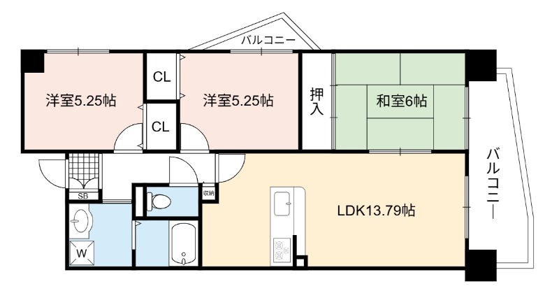 | 間取り詳細 | LDK 13.79畳 、 和室 6畳 、 洋室 5.25畳 、 洋室 5.25畳 |