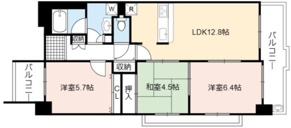 | 間取り詳細 | LDK 12.8畳 、 洋室 6.4畳 、 洋室 5.7畳 、 和室 4.5畳 |