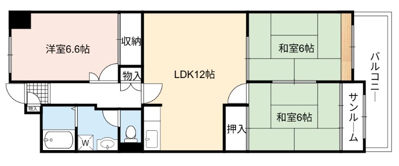 | 間取り詳細 | LDK 12畳 、 洋室 6.6畳 、 和室 6畳 、 和室 6畳 |