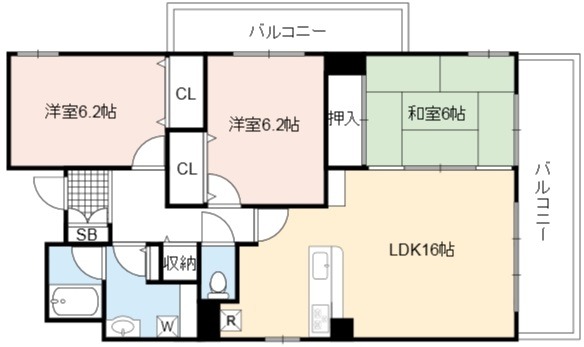 | 間取り詳細 | LDK 16畳 、 洋室 6.2畳 、 洋室 6.2畳 、 和室 6畳 |