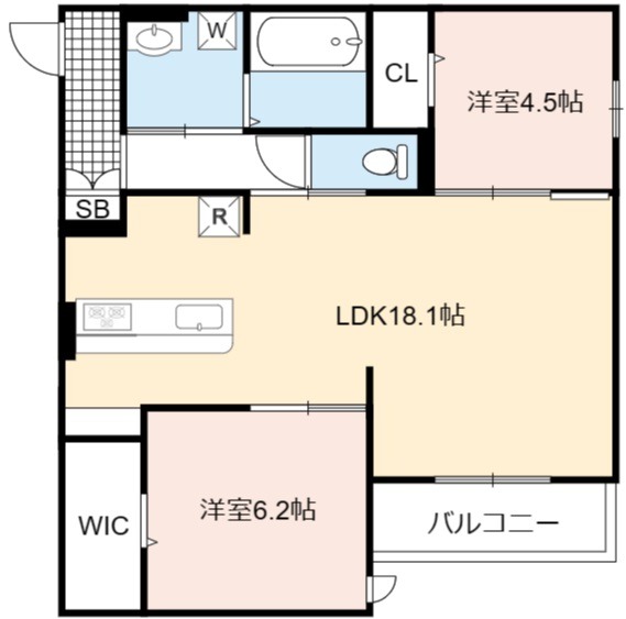 | 間取り詳細 | LDK 18.1畳 、 洋室 6.2畳 、 洋室 4.5畳 |