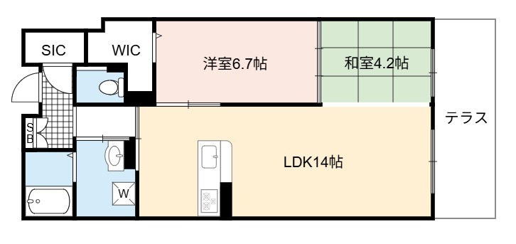 | 間取り詳細 | LDK 14畳 、 洋室 6.7畳 、 和室 4.2畳 |
