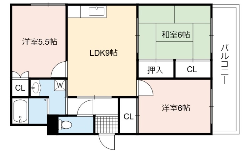 | 間取り詳細 | LDK 9畳 、 洋室 6畳 、 和室 6畳 、 洋室 5.5畳 |