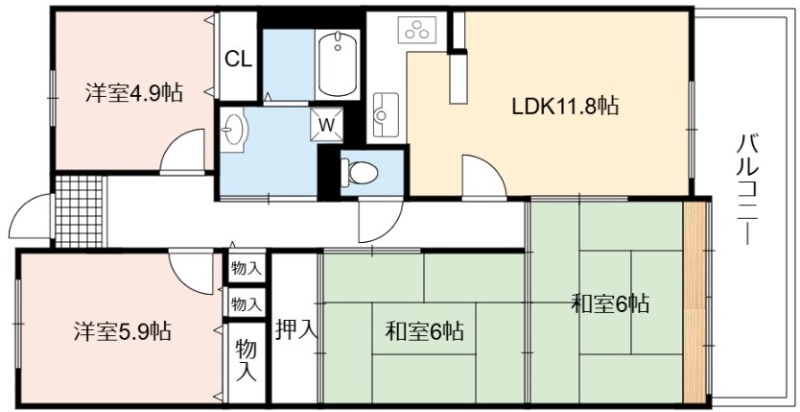 | 間取り詳細 | LDK 11.8畳 、 和室 6畳 、 和室 6畳 、 洋室 5.9畳 、 洋室 4.9畳 |
