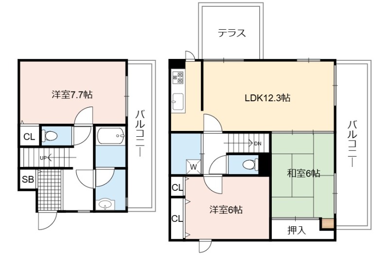 | 間取り詳細 | LDK 12.3畳 、 洋室 7.7畳 、 洋室 6畳 、 和室 6畳 |
