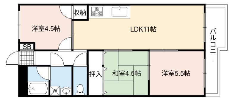 | 間取り詳細 | LDK 11畳 、 洋室 5.5畳 、 洋室 4.5畳 、 和室 4.5畳 |