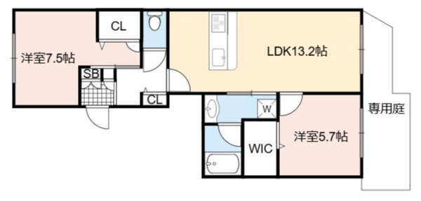 | 間取り詳細 | LDK 13.2畳 、 洋室 7.5畳 、 洋室 5.7畳 |