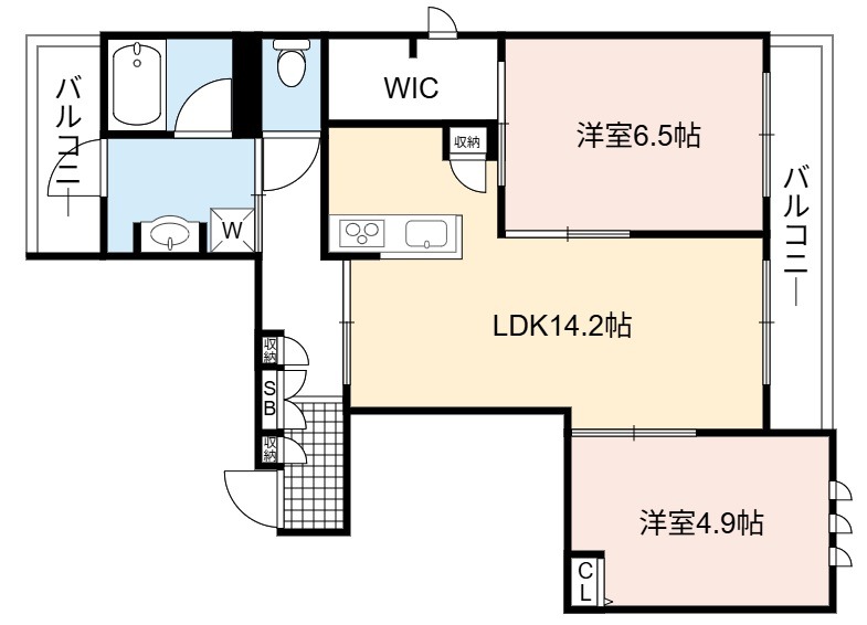 | 間取り詳細 | LDK 14.2畳 、 洋室 6.5畳 、 洋室 4.9畳 |