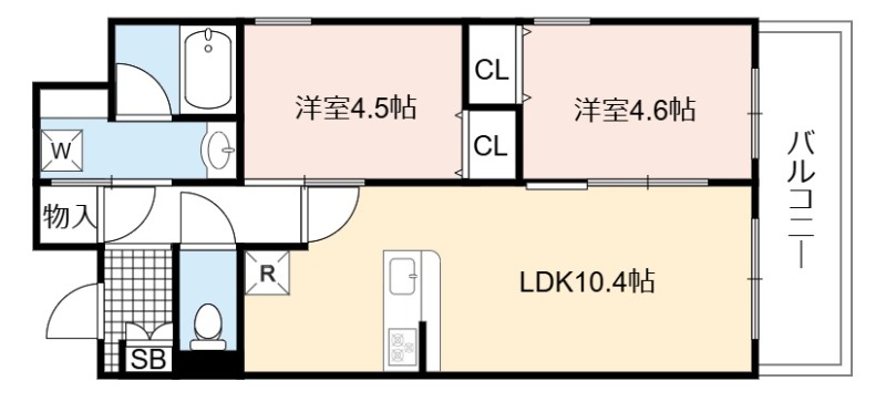 | 間取り詳細 | LDK 10.4畳 、 洋室 4.6畳 、 洋室 4.5畳 |