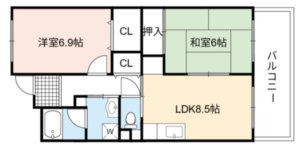 | 間取り詳細 | LDK 8.5畳 、 洋室 6.9畳 、 和室 6畳 |