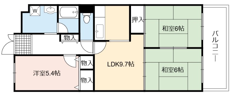 | 間取り詳細 | DK 9.7畳 、 和室 6畳 、 和室 6畳 、 洋室 5.4畳 |