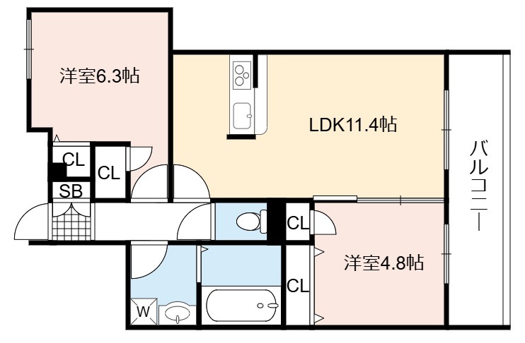 | 間取り詳細 | LDK 11.4畳 、 洋室 6.3畳 、 洋室 4.8畳 |