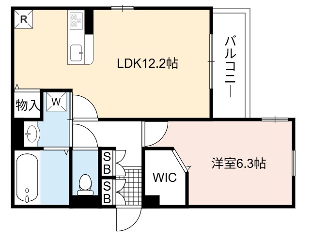 | 間取り詳細 | LDK 12.2畳 、 洋室 6.3畳 |