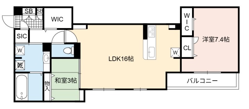 | 間取り詳細 | LDK 16畳 、 洋室 7.4畳 、 和室 3.3畳 |