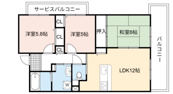| 間取り詳細 | LDK 12畳 、 和室 6畳 、 洋室 5.8畳 、 洋室 5畳 |