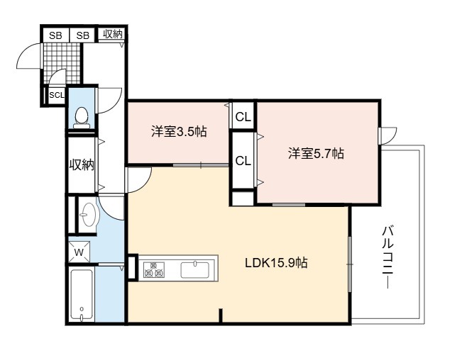 | 間取り詳細 | LDK 15.9畳 、 洋室 5.7畳 、 洋室 3.5畳 |