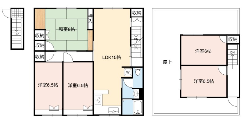 | 間取り詳細 | LDK 15畳 、 洋室 6.5畳 、 洋室 6.5畳 、 洋室 6.5畳 、 洋室 6畳 、 和室 8畳 |