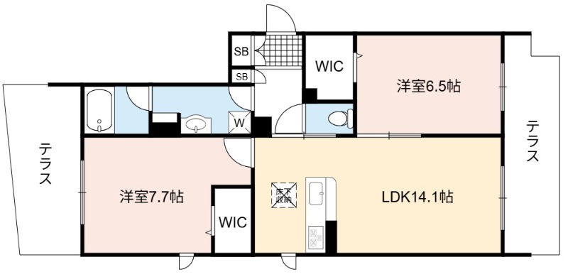 | 間取り詳細 | LDK 14.1畳 、 洋室 7.7畳 、 洋室 6.5畳 |