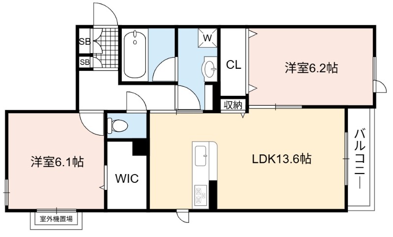 | 間取り詳細 | LDK 13.6畳 、 洋室 6.2畳 、 洋室 6.1畳 |