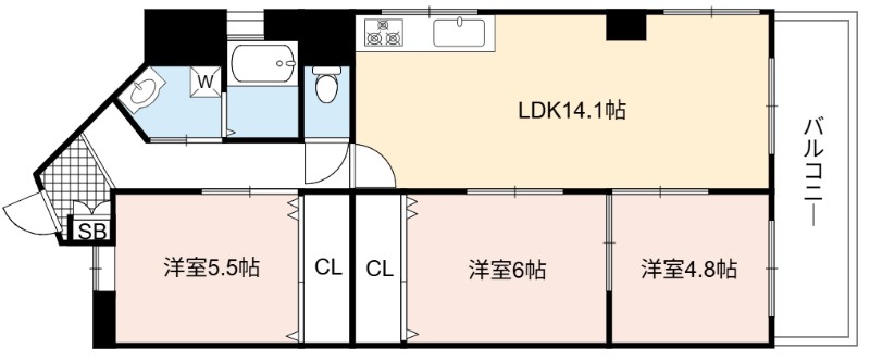 | 間取り詳細 | LDK 14.1畳 、 洋室 6畳 、 洋室 5.5畳 、 洋室 4.8畳 |