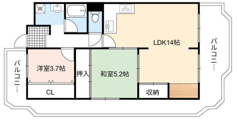 | 間取り詳細 | LDK 14畳 、 洋室 5.2畳 、 洋室 3.7畳 |