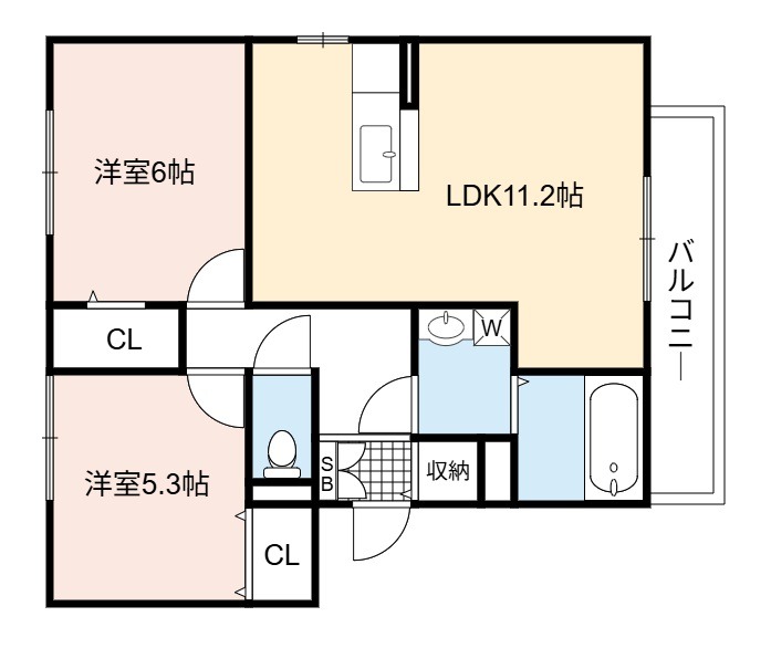| 間取り詳細 | LDK 11.2畳 、 洋室 6畳 、 洋室 5.3畳 |