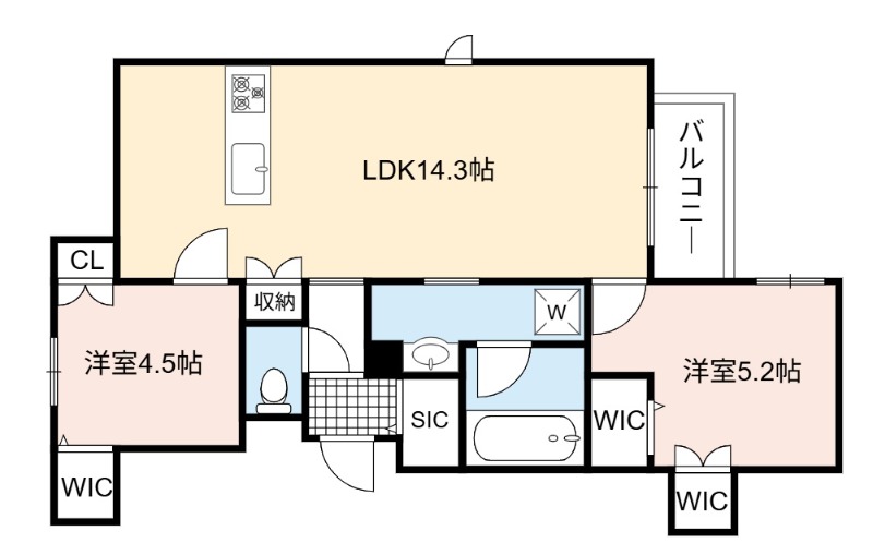 | 間取り詳細 | LDK 14.3畳 、 洋室 5.2畳 、 洋室 4.5畳 |