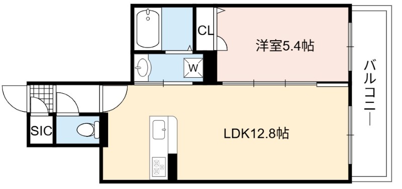 | 間取り詳細 | LDK 12.8畳 、 洋室 5.4畳 |