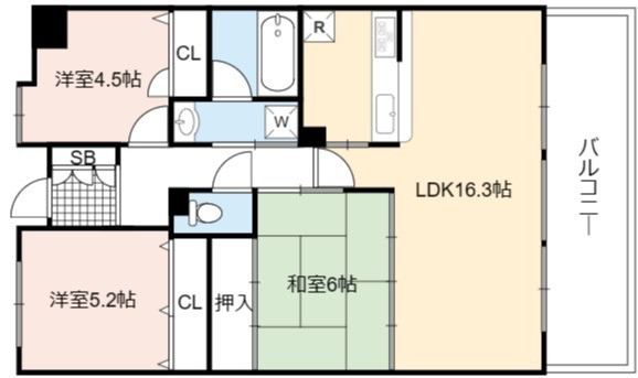 | 間取り詳細 | LDK 16.3畳 、 和室 6畳 、 洋室 5.2畳 、 洋室 4.5畳 |