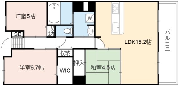 | 間取り詳細 | LDK 15.2畳 、 洋室 6.7畳 、 洋室 5畳 、 和室 4.5畳 |