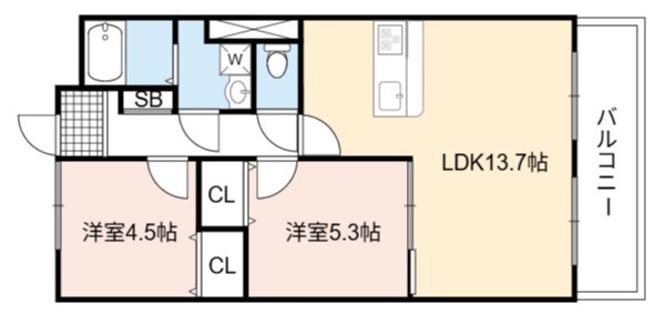 | 間取り詳細 | LDK 13.7畳 、 和室 5.3畳 、 洋室 4.5畳 |