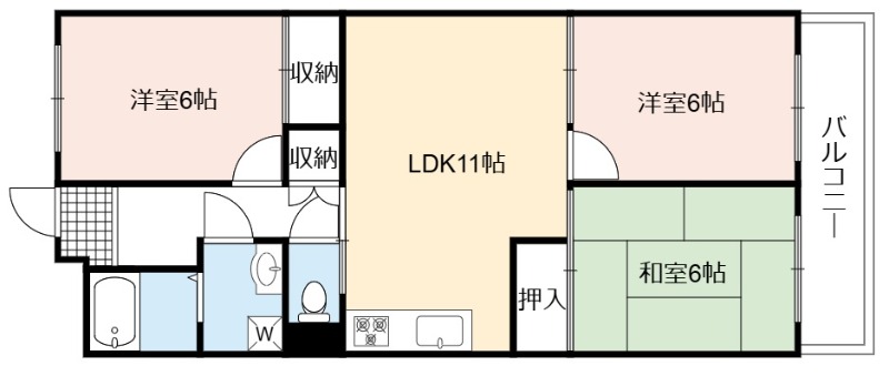 | 間取り詳細 | LDK 11畳 、 洋室 6畳 、 洋室 6畳 、 和室 6畳 |