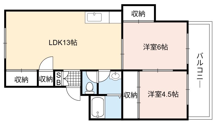 | 間取り詳細 | LDK 13畳 、 洋室 6畳 、 洋室 4.5畳 |