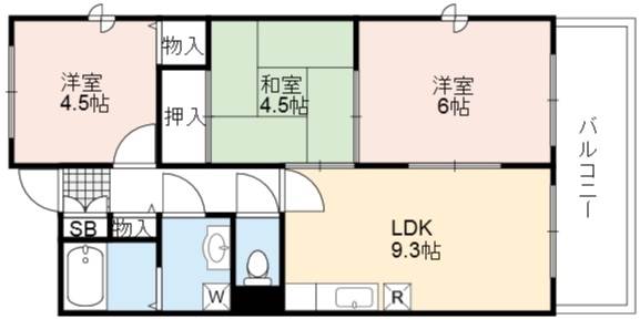 | 間取り詳細 | DK 9.3畳 、 洋室 6畳 、 洋室 4.5畳 、 和室 4.5畳 |