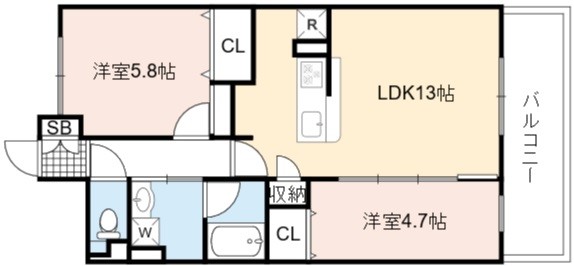 | 間取り詳細 | LDK 13畳 、 洋室 5.8畳 、 洋室 4.7畳 |