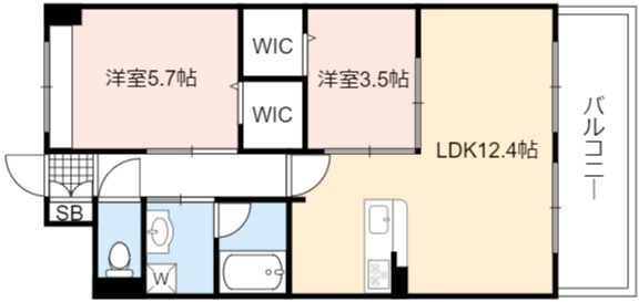 | 間取り詳細 | LDK 12.4畳 、 洋室 5.7畳 、 洋室 3.5畳 |