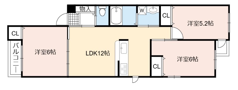 | 間取り詳細 | LDK 12畳 、 洋室 6畳 、 洋室 6畳 、 洋室 5.2畳 |