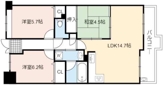 | 間取り詳細 | LDK 14.7畳 、 洋室 6.2畳 、 洋室 5.7畳 、 和室 4.5畳 |