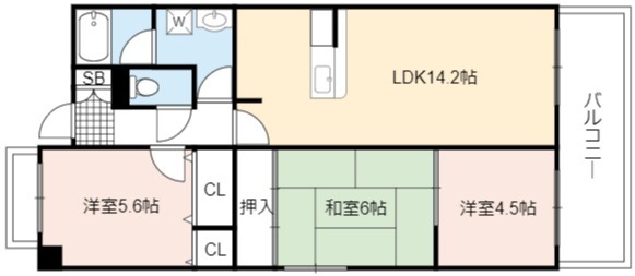 | 間取り詳細 | LDK 14.2畳 、 和室 6畳 、 洋室 5.6畳 、 洋室 4.5畳 |