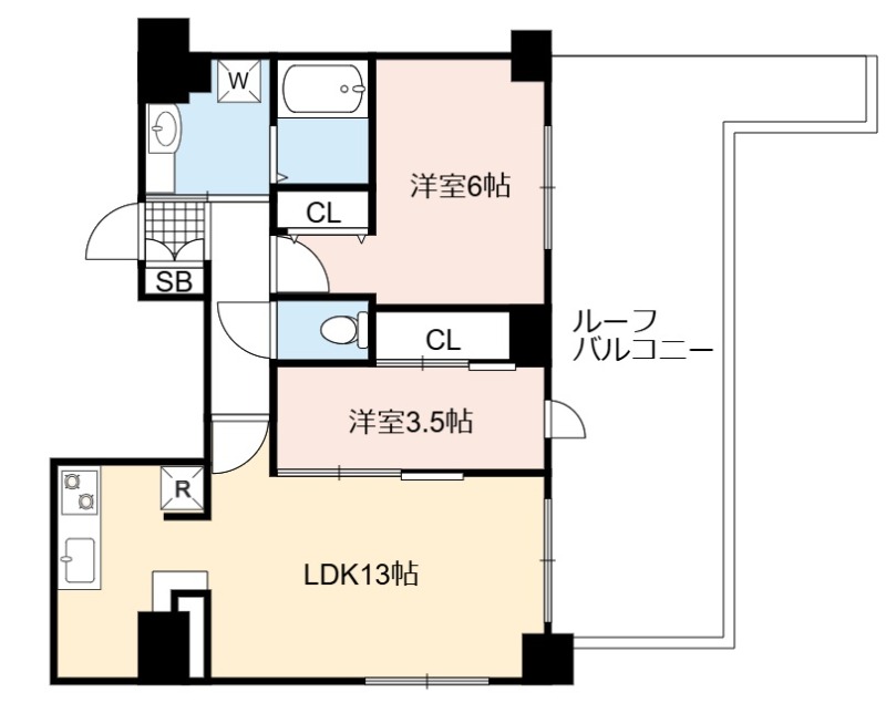 | 間取り詳細 | LDK 13畳 、 洋室 6畳 、 洋室 3.5畳 |