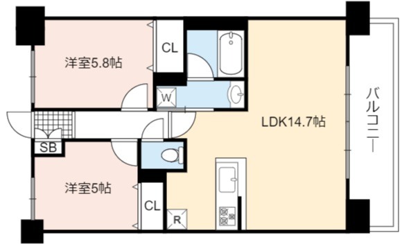 | 間取り詳細 | LDK 14.7畳 、 洋室 5.8畳 、 洋室 5畳 |