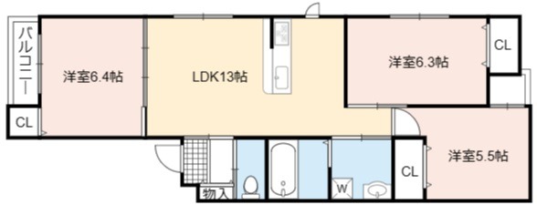 | 間取り詳細 | LDK 13畳 、 洋室 6.4畳 、 洋室 6.3畳 、 洋室 5.5畳 |