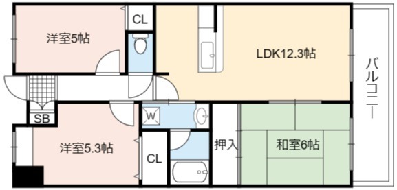 | 間取り詳細 | LDK 12.3畳 、 和室 6畳 、 洋室 5.3畳 、 洋室 5畳 |
