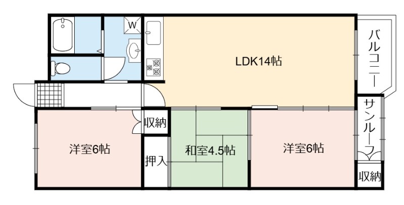 | 間取り詳細 | LDK 14畳 、 洋室 6畳 、 洋室 6畳 、 和室 4.5畳 |